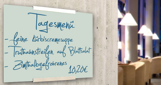 Für die Präsentation des Tagesmenüs in der Lobby oder vor dem Restaurant. Hochformatig oder querformatig, zum einfachen Beschriften mit Kreidestiften (trocken abwischbar).