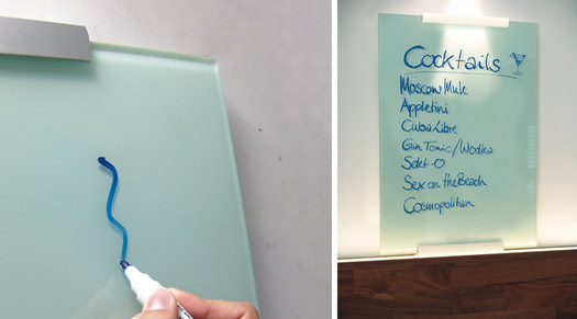 Beschriftbare Wandtafeln aus Glas, temperiertes 6mm starkes Glaspaneel, Rückseite weiß. Befestigung mit 2 Stück Clamper aus silber eloxiertem Aluminium.