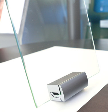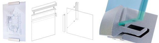 Die Clamper werden mit nur zwei Bohrungen an der Wand nach Wunsch oben, unten oder seitlich fixiert. Dann können mit einem Handgriff zwei Glasscheiben im Sandwichsystem oder eine Glasscheibe (in verschiedene Stärken) eingesetzt werden ...