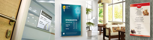 Die Einlagekarten werden über den Office-Drucker angefertigt. Schild einfach öffnen, Karte einlegen, schliessen - fertig!