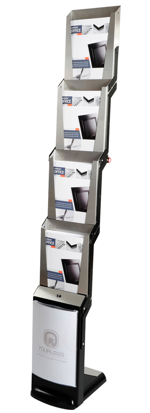 real steel ist ähnlich einfach zu bedienen, wie ein Regenschirm: Im Handumdrehen entfaltet er sich zu einem stabilen Prospektpräsenter. Die 4 Prospekttaschen für A4-Formate sind aus gebürstetem Edelstahl - dank einer speziellen Beschichtung hinterlassen Finger kaum sichtbare Spuren ...