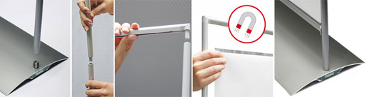 myMAGO stand up displays bestehen aus einer einfach und schnell aufbaubaren Aluminiumkonstruktion mit Kunststoffverbindern. Das besondere Highlight ist die Bannerbefestigung mit Magnettechnik. Damit wird jeder Bannerwechsel zum "Kinderspiel".